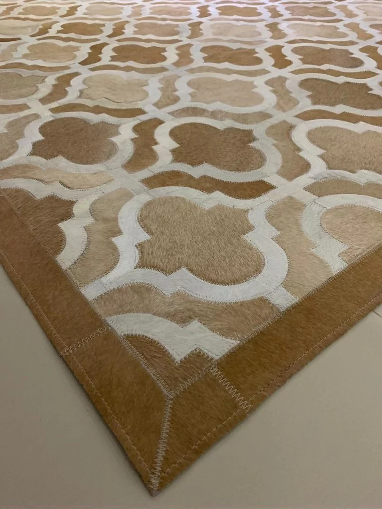 Confeccionado com recortes geométricos de couro legítimo natural em tons bege e branco. Tapete forrado, antiderrapante , impermeável e com tratamento especial para decoração.
