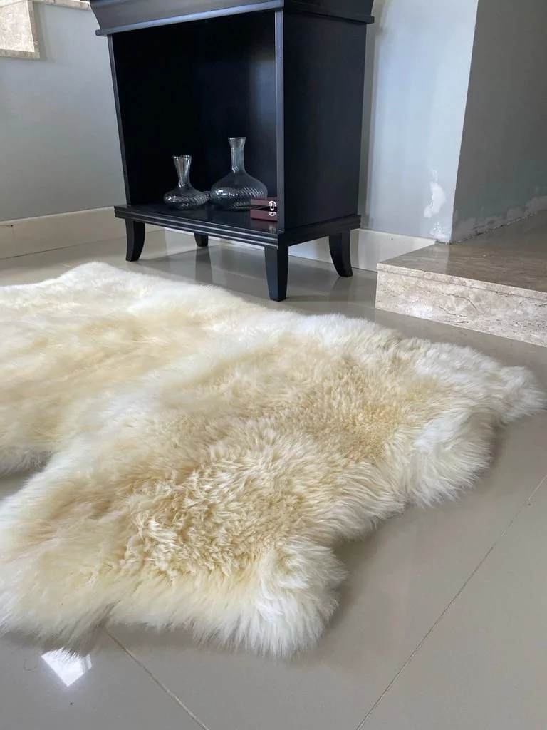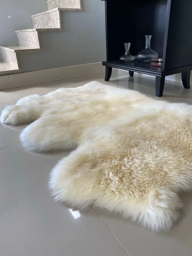 Confeccionado com recortes quadrados de pele ovina legítima nos tons de bege. Tapete com forro 100% algodão e e com tratamento especial para decoração. Certificação ISO 9001 de qualidade internacional.
