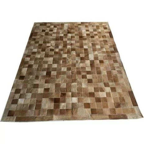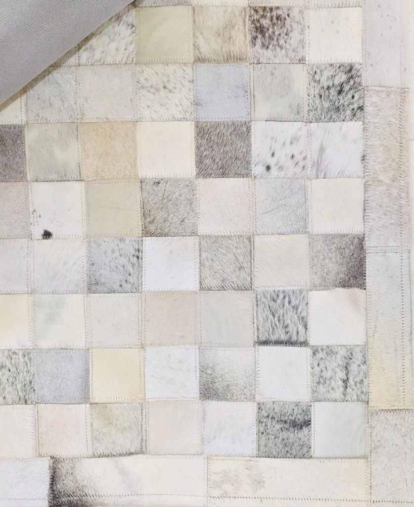 Confeccionado com recortes quadrados de couro legítimo natural em tons de prata, cinza claro e bege claro. Tapete forrado, antiderrapante , impermeável e com tratamento especial para decoração.
