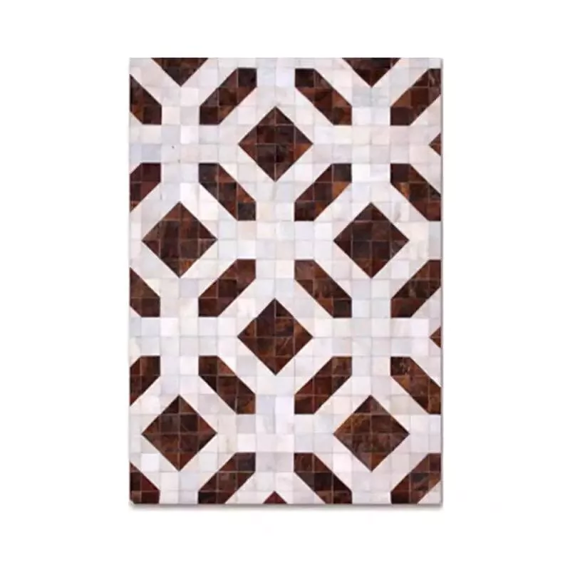Confeccionado com recortes geométricos de couro legítimo natural em tons caramelo, bege, marrom, castanho, creme e marfim. Tapete forrado, antiderrapante , impermeável e com tratamento especial para decoração.