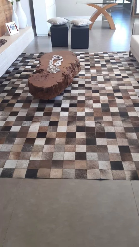 Confeccionado com recortes quadrados de couro legítimo natural em tons de cinza e marrom. Tapete forrado, antiderrapante , impermeável e com tratamento especial para decoração.