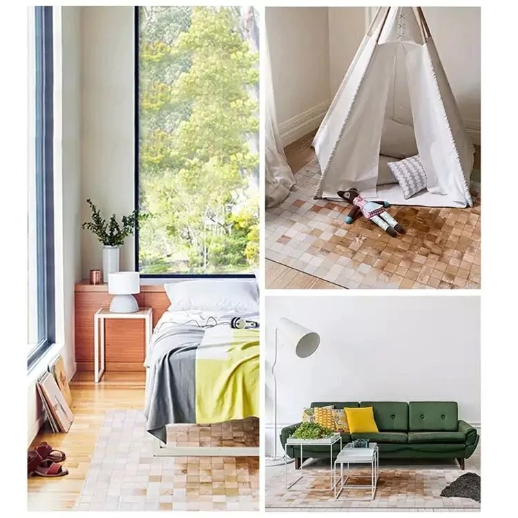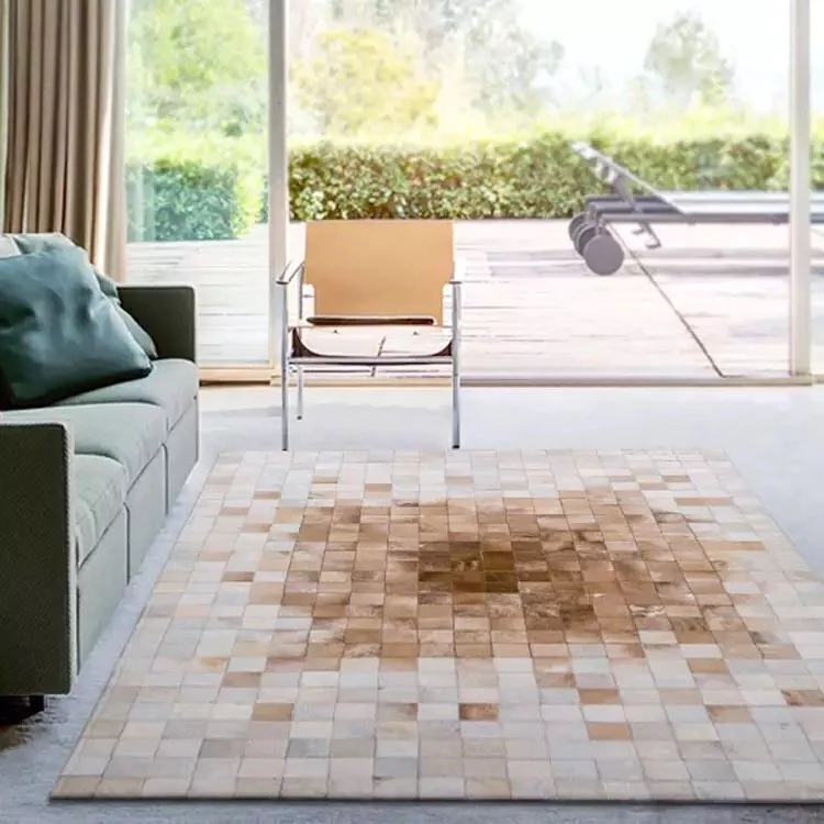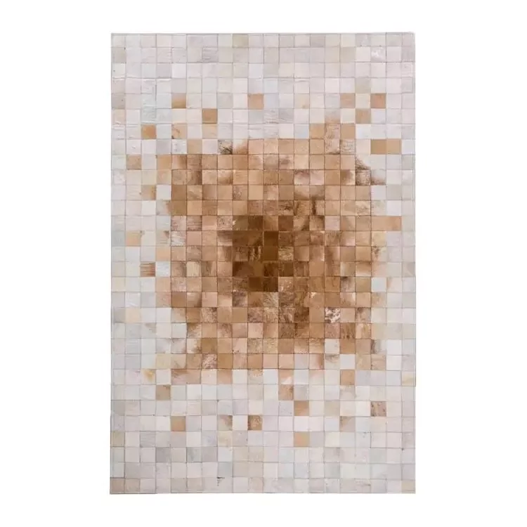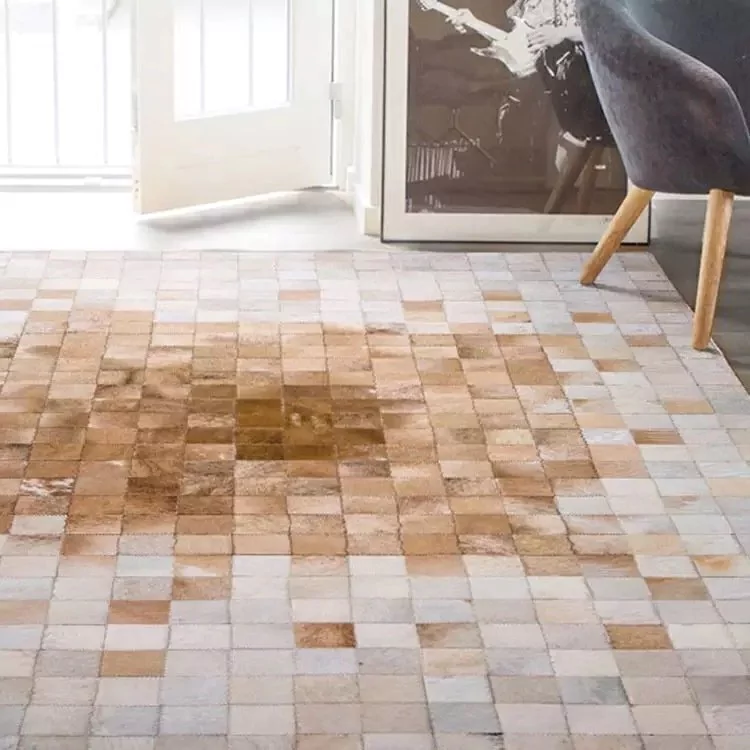 Confeccionado com recortes quadrados de couro legítimo natural em tons de Marfim e Bege. Tapete forrado, antiderrapante , impermeável e com tratamento especial para decoração.