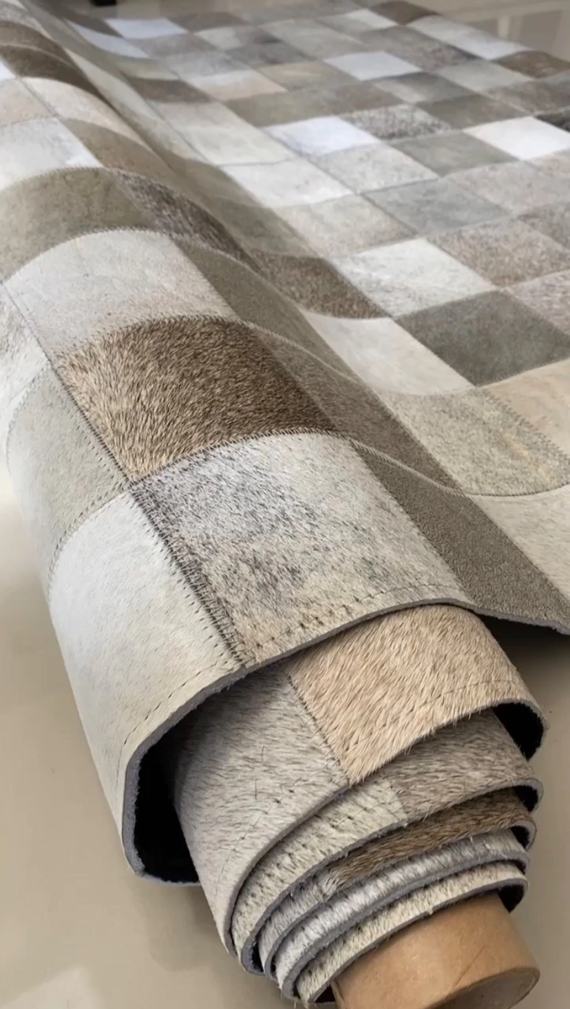 Tapete de Couro confeccionado com recortes quadriculados de couro legítimo natural em tons cinza claro natural. Tapete forrado, antiderrapante e com tratamento especial para decoração.