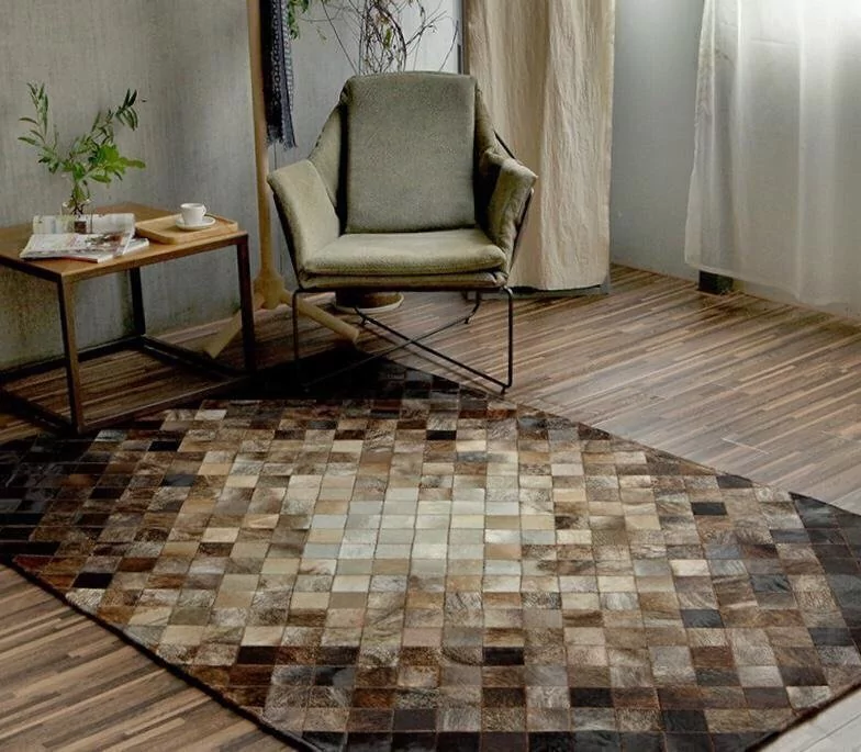 Confeccionado com recortes quadrados de couro legítimo natural em tons de Marrom e bege. Tapete forrado, antiderrapante , impermeável e com tratamento especial para decoração.