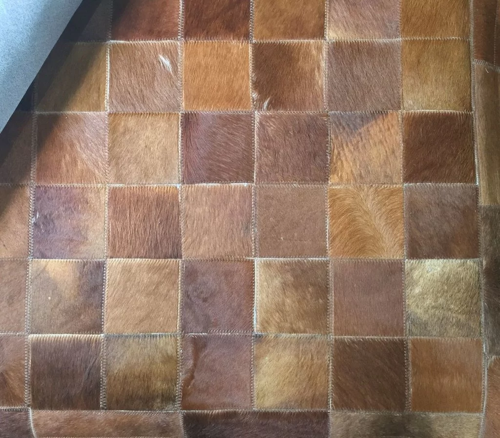 Tapete de couro confeccionado com retalhos de couro legítimo natural em tons de marorm e caramelo. Tapete forrado, antiderrapante , impermeável e com tratamento especial para decoração.