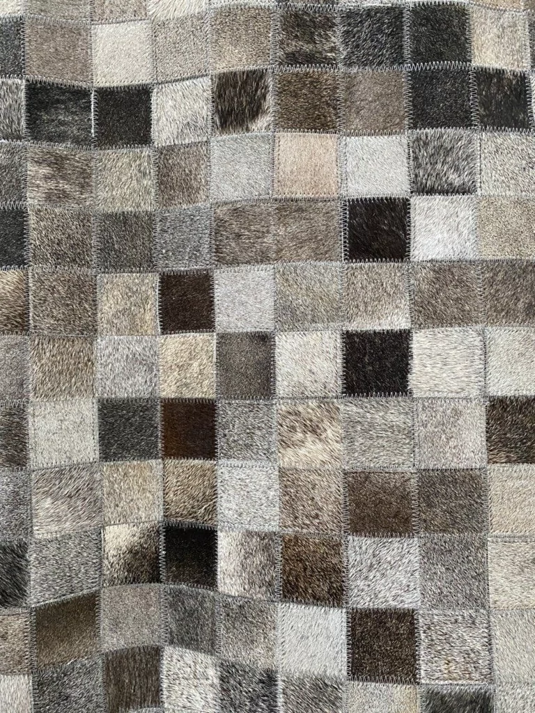Confeccionado com recortes quadrados de couro legítimo natural em tons cinza e cinza escuro. Tapete forrado, antiderrapante , impermeável e com tratamento especial para decoração.