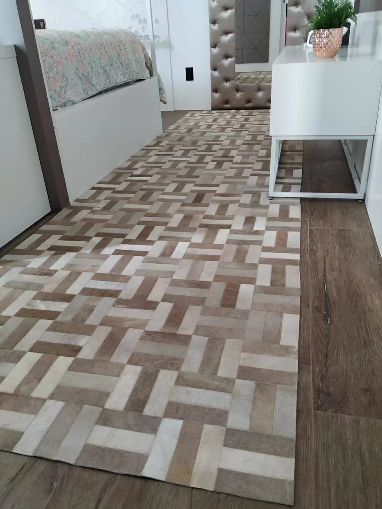 Confeccionado com recortes quadrados de couro legítimo natural em tons champanhe, marfim e branco. Tapete forrado, antiderrapante , impermeável e com tratamento especial para decoração.