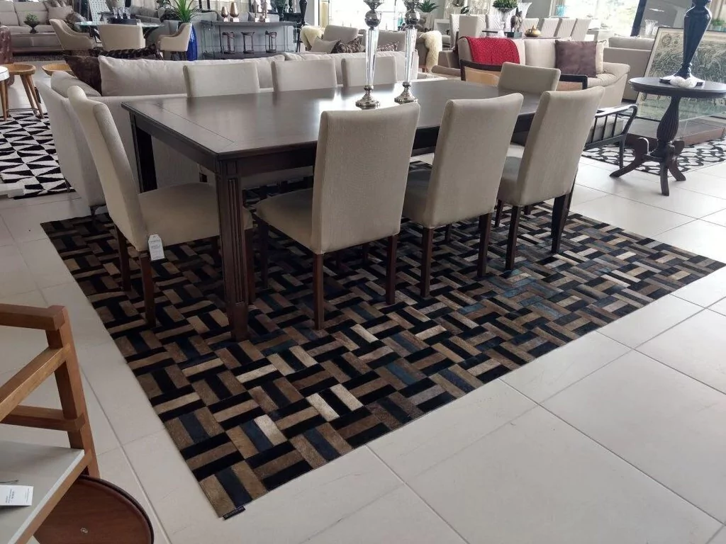 Confeccionado com recortes quadrados de couro legítimo natural em tons preto, bege, dark gris grey e marrom. Tapete forrado, antiderrapante , impermeável e com tratamento especial para decoração.