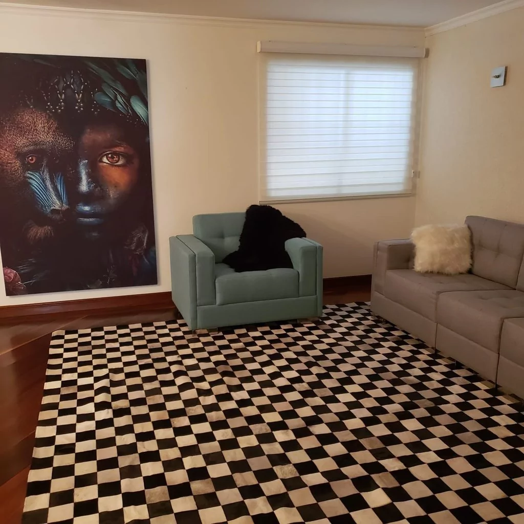 onfeccionado com recortes quadrados de couro legítimo natural em tons marrom e bege. Tapete forrado, antiderrapante , impermeável e com tratamento especial para decoração.