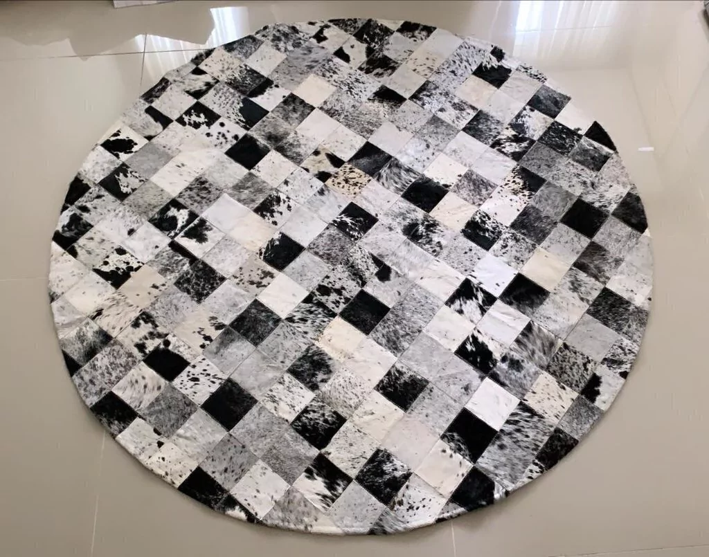 Confeccionado com recortes quadrados de couro legítimo natural em tons branco, cinza e preto. Tapete forrado, antiderrapante , impermeável e com tratamento especial para decoração.