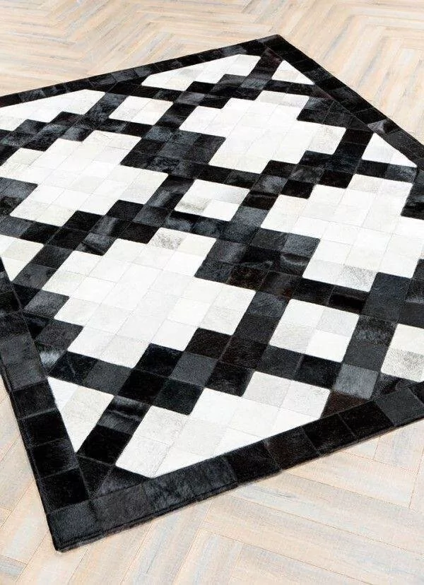 Confeccionado com recortes quadrados de couro legítimo natural em tons branco e preto. Tapete forrado, antiderrapante , impermeável e com tratamento especial para decoração.