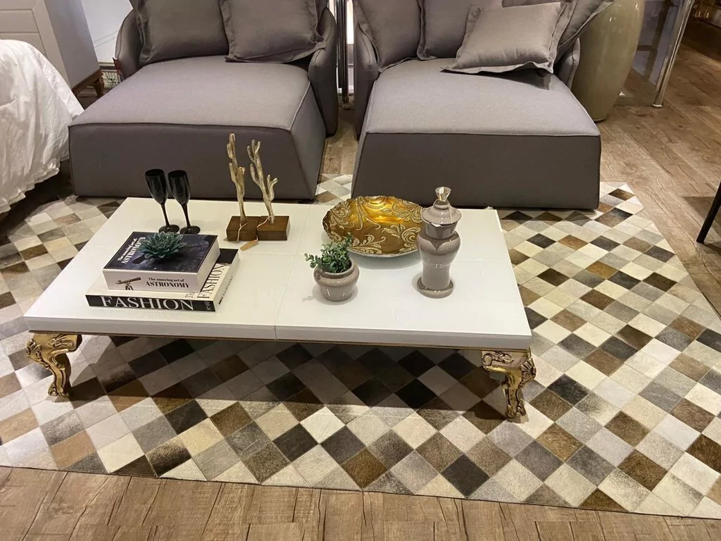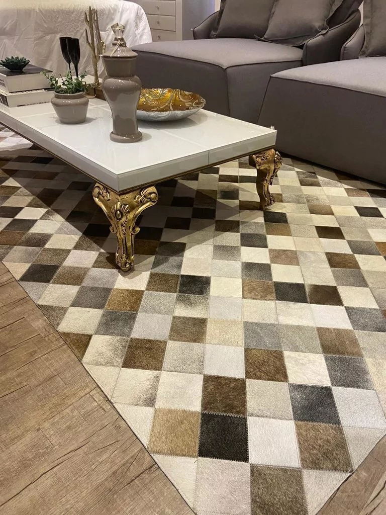 Confeccionado com recortes quadrados de couro legítimo natural em tons branco, cinza, bege, creme, marrom e preto.Tapete forrado, antiderrapante , impermeável e com tratamento especial para decoração.