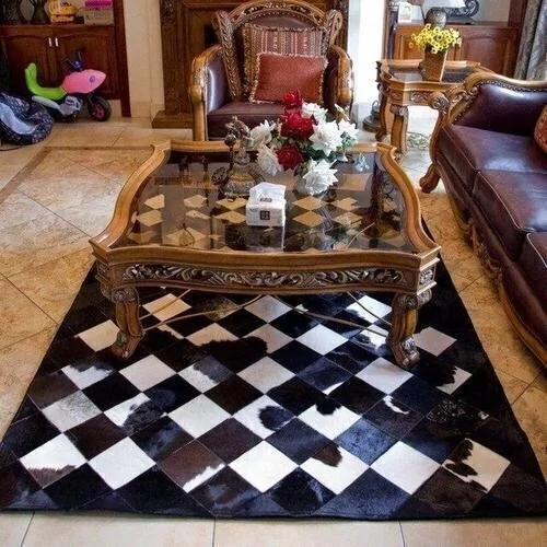 Confeccionado com recortes quadrados de couro legítimo natural em tons preto e branco. Tapete forrado, antiderrapante , impermeável e com tratamento especial para decoração.