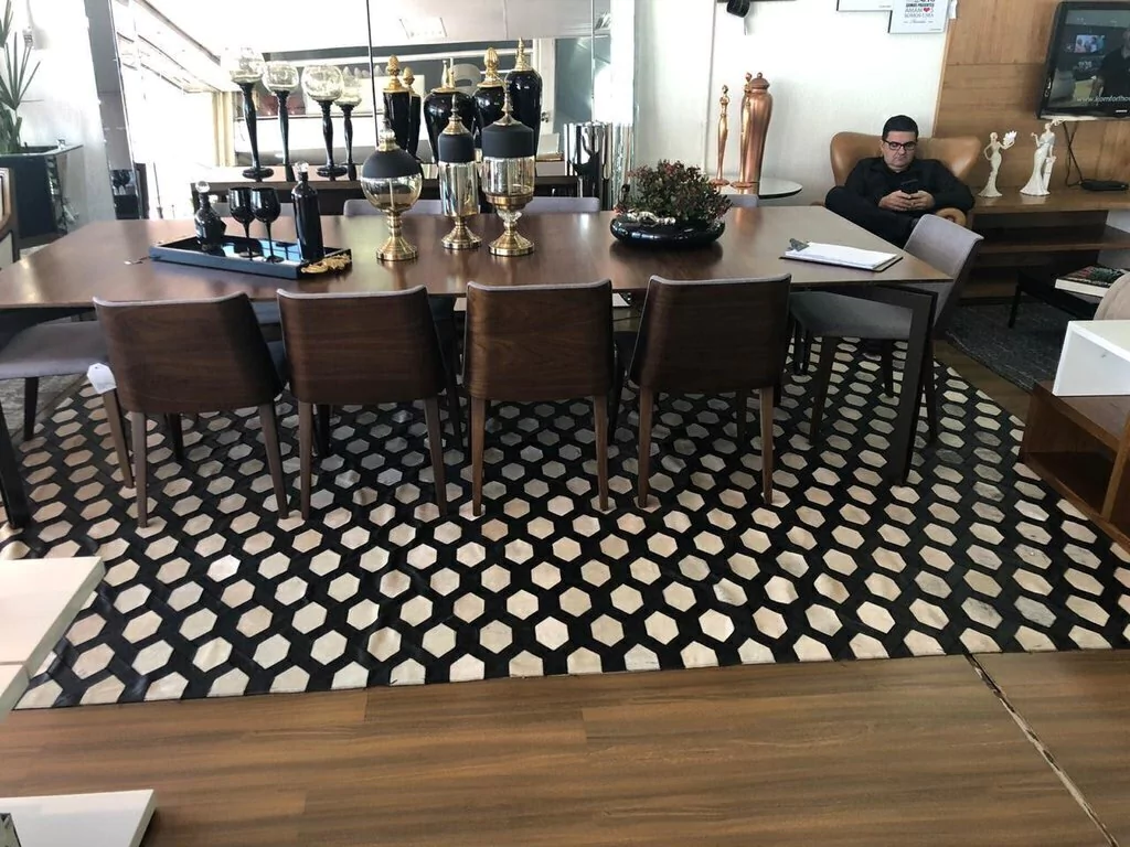 Confeccionado com recortes quadrados de couro legítimo natural em tons de marfin, creme e preto. Tapete forrado, antiderrapante , impermeável e com tratamento especial para decoração.