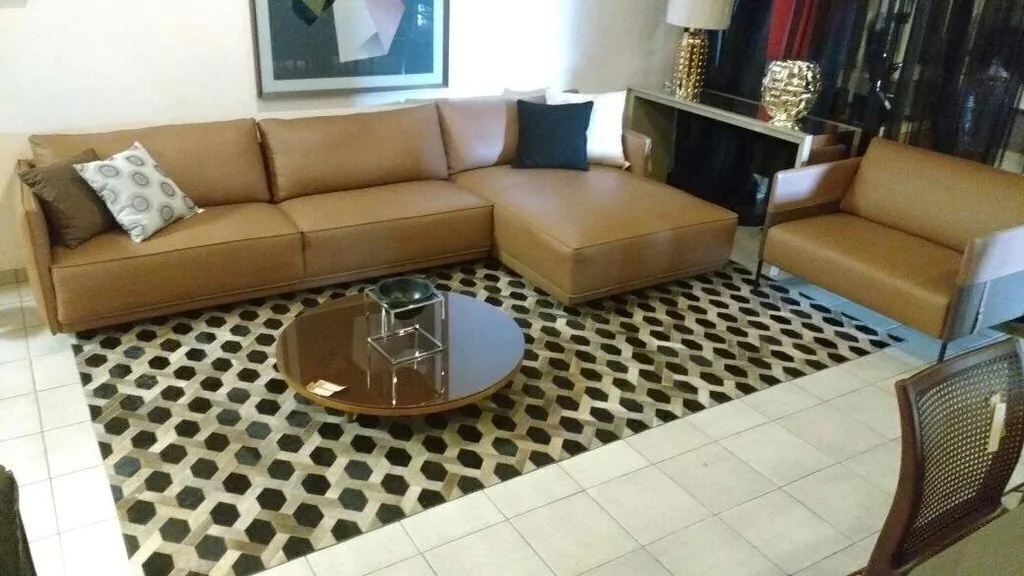 Confeccionado com recortes quadrados de couro legítimo natural em tons de ouro envelhecido, dourado e preto. Tapete forrado, antiderrapante , impermeável e com tratamento especial para decoração.