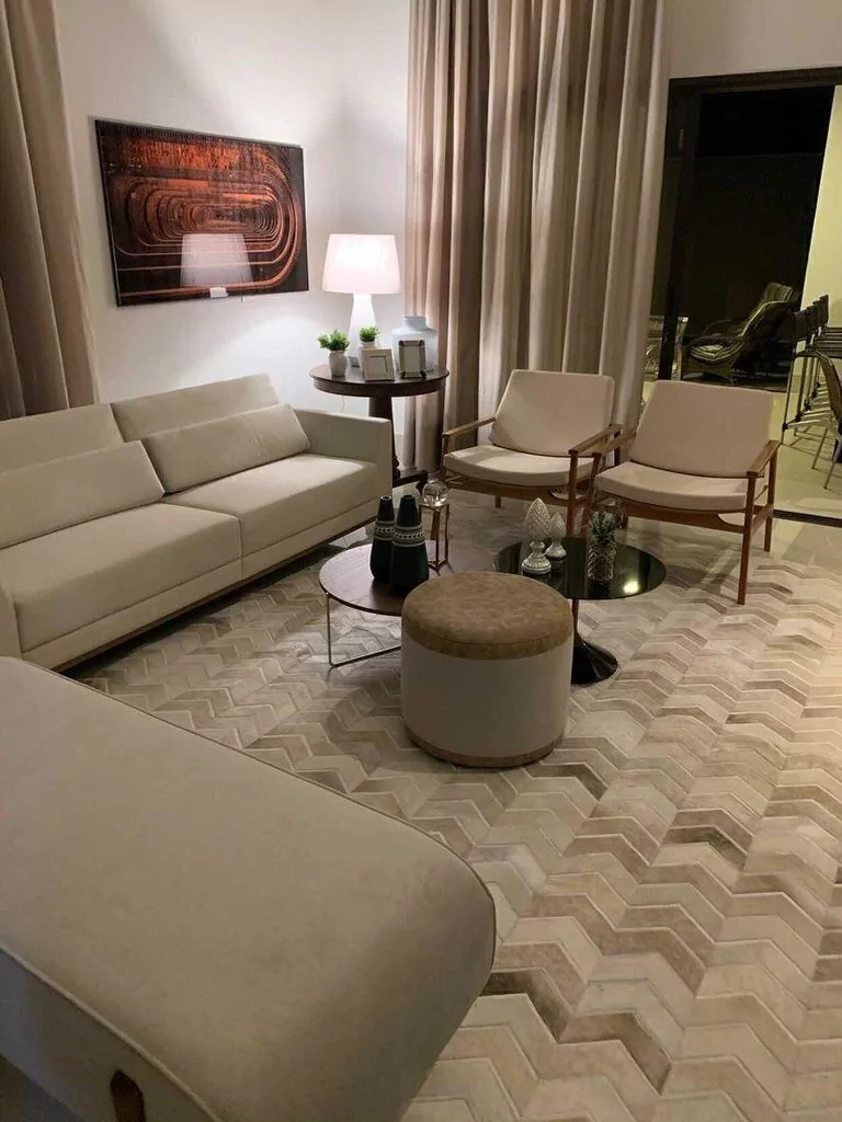 Confeccionado com recortes geométricos de couro legítimo natural em tons champanhe claro. Tapete forrado, antiderrapante , impermeável e com tratamento especial para decoração.