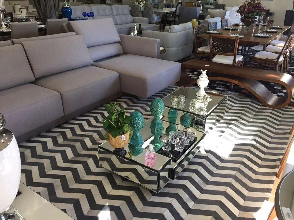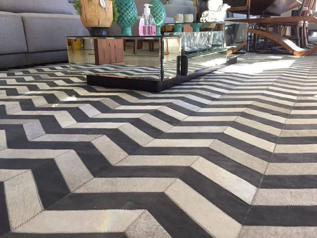 Confeccionado com recortes quadrados de couro legítimo natural em tons preto e cinza. Tapete forrado, antiderrapante , impermeável e com tratamento especial para decoração.