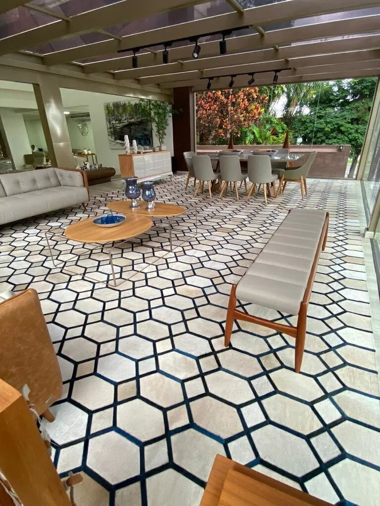 Confeccionado com recortes quadrados de couro legítimo natural em tons champanhe, bege,creme,rosé e preto. Tapete forrado, antiderrapante , impermeável e com tratamento especial para decoração.