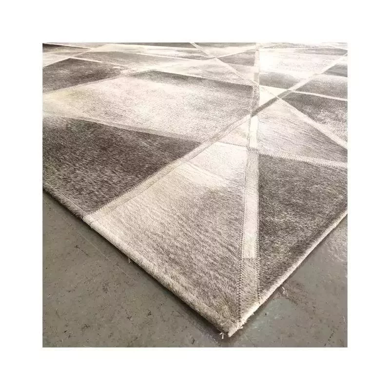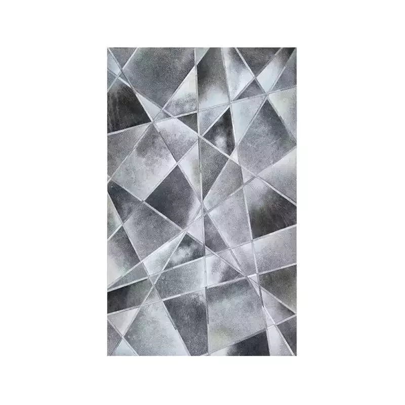 Confeccionado com recortes geométricos de couro legítimo natural em tons de cinza. Tapete forrado, antiderrapante , impermeável e com tratamento especial para decoração.