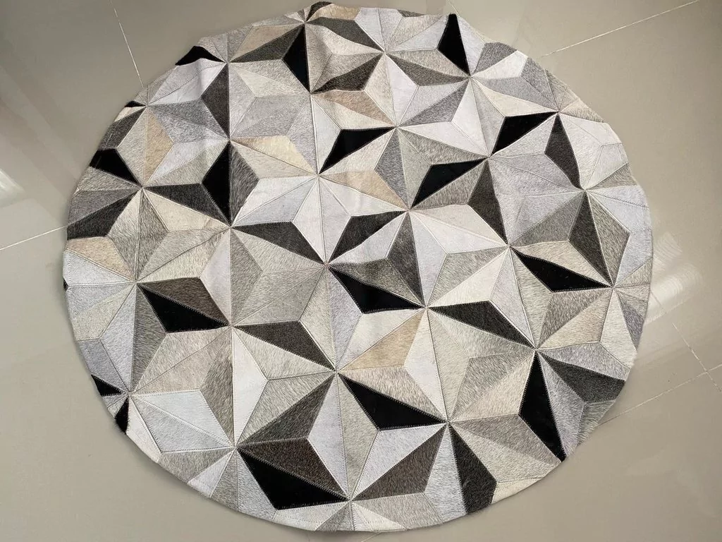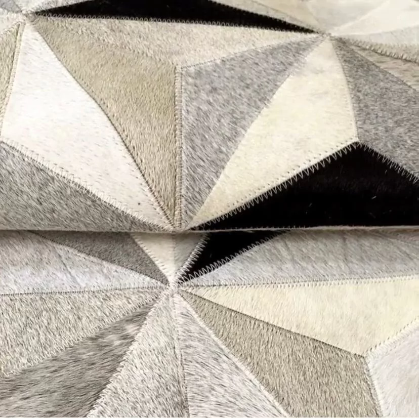Confeccionado com recortes quadrados de couro legítimo natural em tons cinza. Tapete forrado, antiderrapante , impermeável e com tratamento especial para decoração.