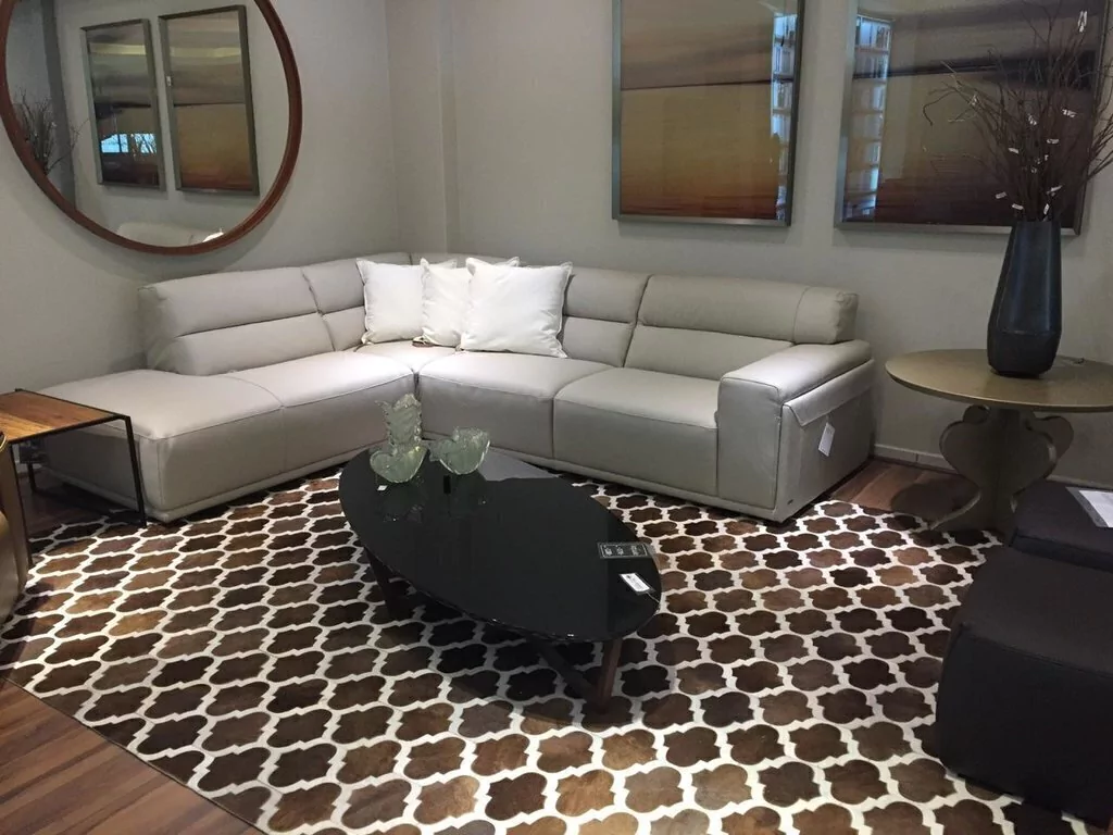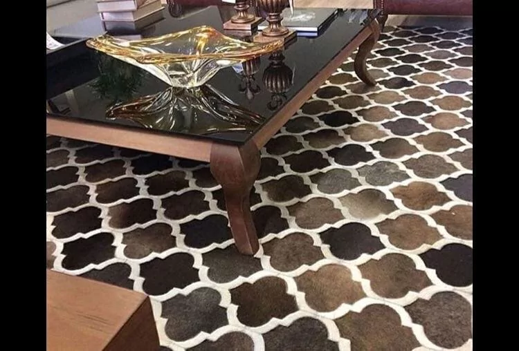 Confeccionado com recortes geométricos de couro legítimo natural em tons café, marrom escuro, bege e branco. Tapete forrado, antiderrapante , impermeável e com tratamento especial para decoração.