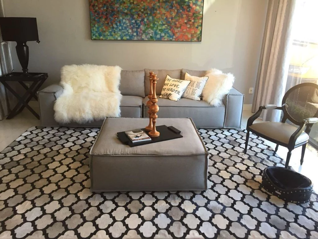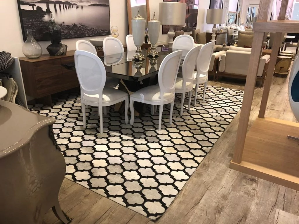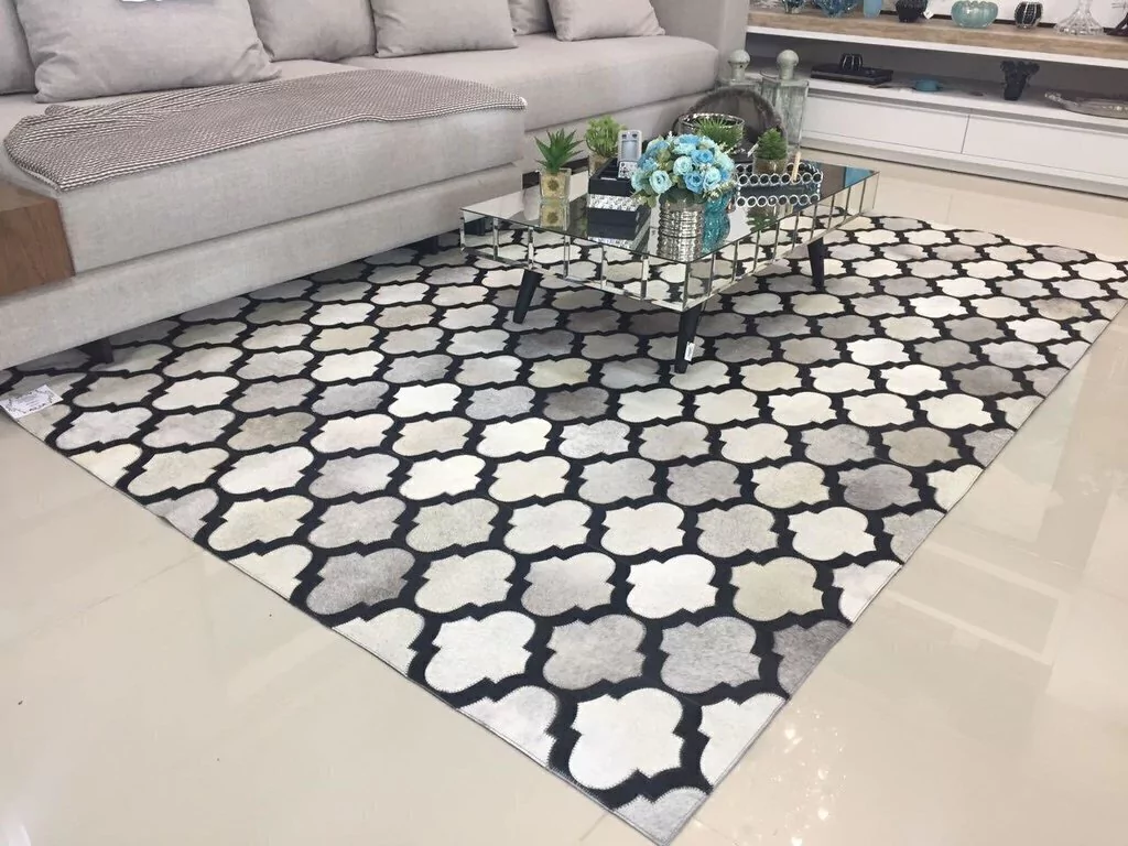Confeccionado com recortes geométricos de couro legítimo natural em tons branco, preto, cinza e creme. Tapete forrado, antiderrapante , impermeável e com tratamento especial para decoração.