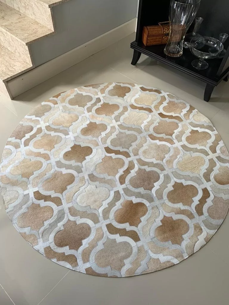 Confeccionado com recortes quadrados de couro legítimo natural em tons bege. Tapete forrado, antiderrapante , impermeável e com tratamento especial para decoração.