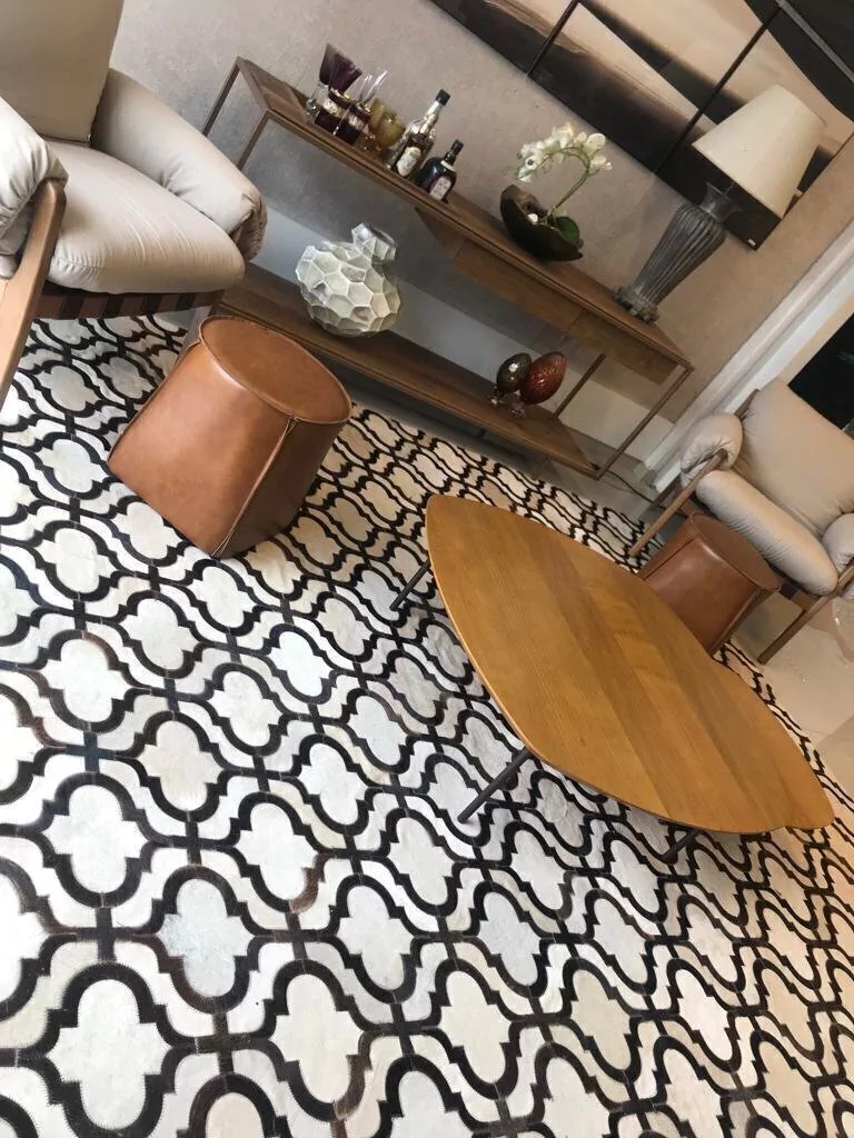Confeccionado com recortes quadrados de couro legítimo natural em tons branco marfin, creme. Tapete forrado, antiderrapante , impermeável e com tratamento especial para decoração.