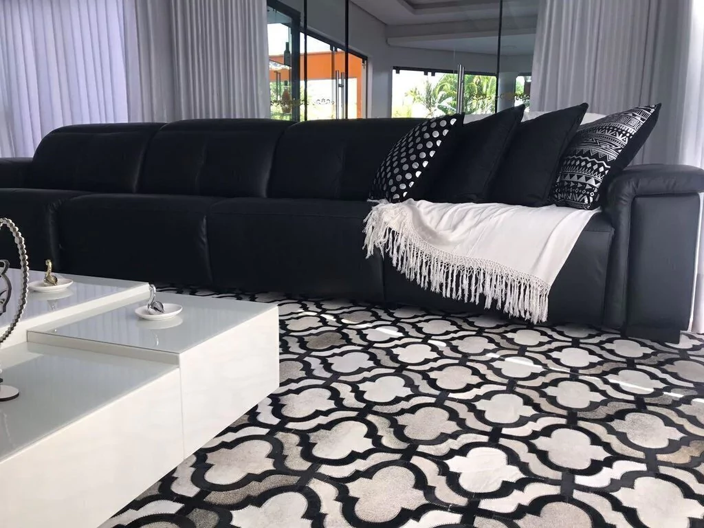 Confeccionado com recortes quadrados de couro legítimo natural em tons preto e cinza. Tapete forrado, antiderrapante , impermeável e com tratamento especial para decoração.