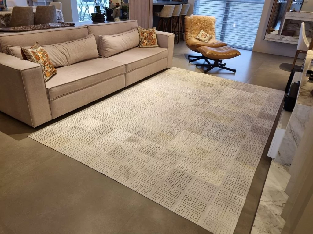 Confeccionado com recortes quadrados de couro legítimo natural em tons marfim. Tapete forrado, antiderrapante , impermeável e com tratamento especial para decoração.