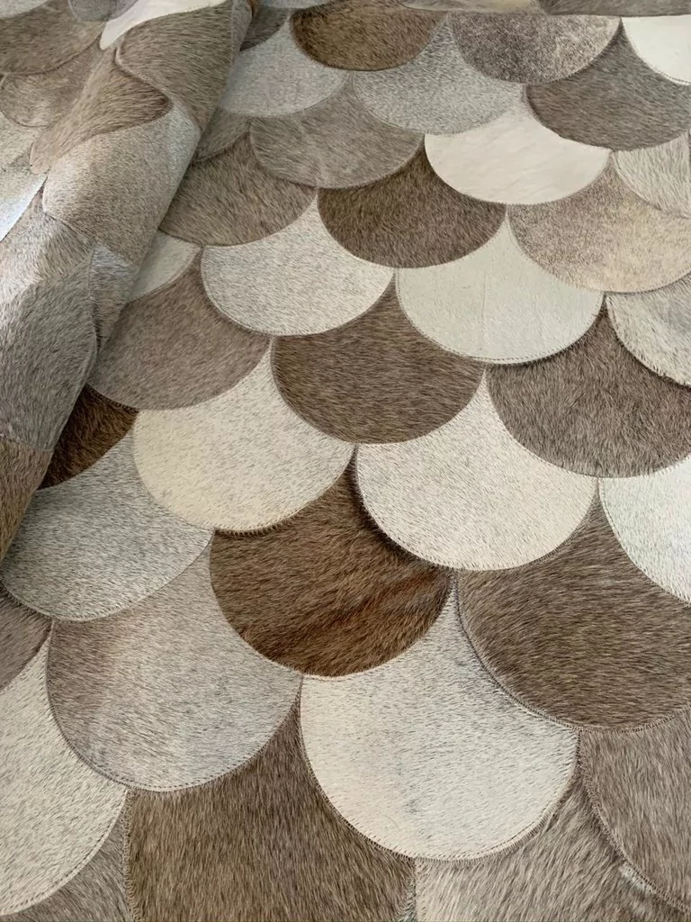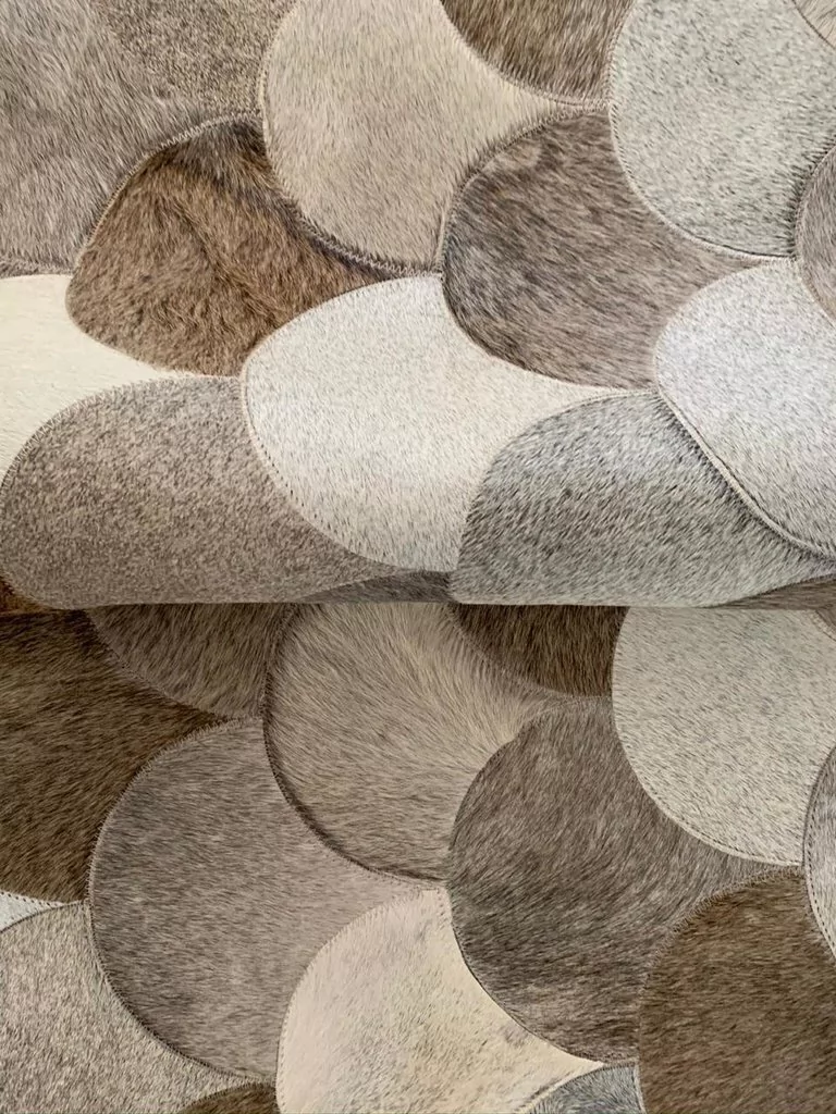 Confeccionado com recortes quadrados de couro legítimo natural em tons cinza, bege escuro, marfin e creme. Tapete forrado, antiderrapante , impermeável e com tratamento especial para decoração.