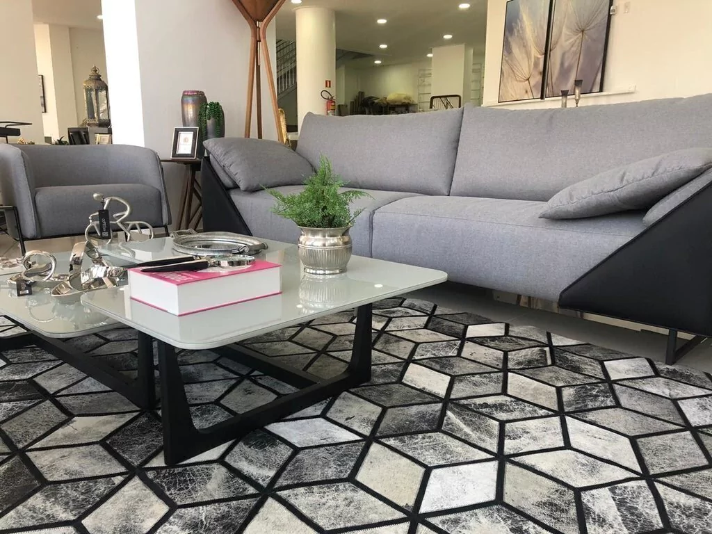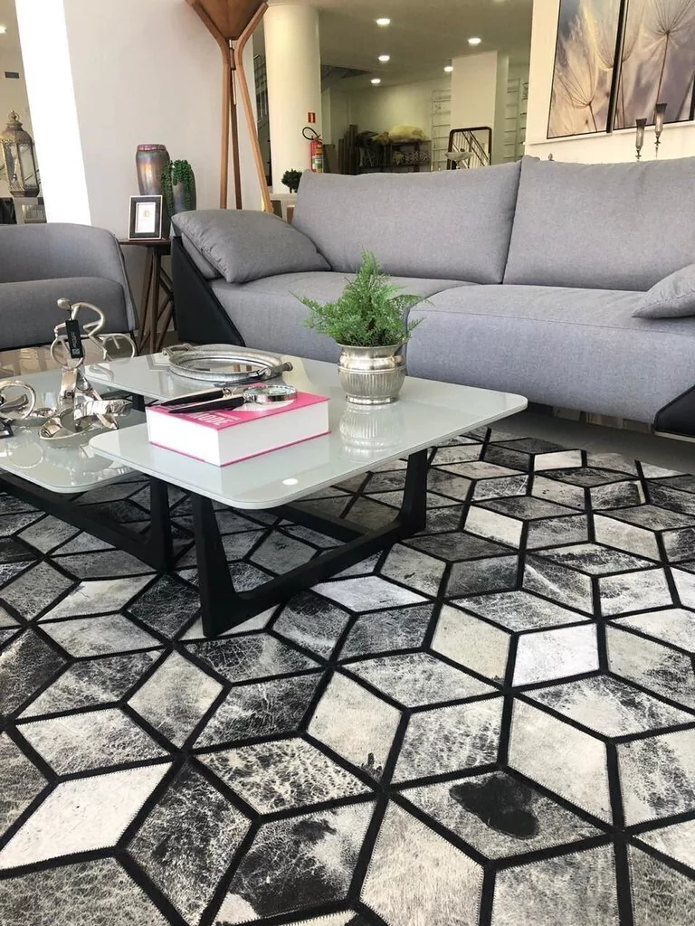 Confeccionado com recortes quadrados de couro legítimo natural em tons de preto, branco e cinza. Tapete forrado, antiderrapante , impermeável e com tratamento especial para decoração.