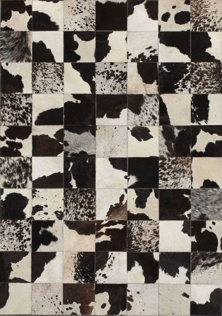 Confeccionado com recortes quadrados de couro legítimo natural em tons malhado preto, creme e branco. Tapete forrado, antiderrapante , impermeável e com tratamento especial para decoração.