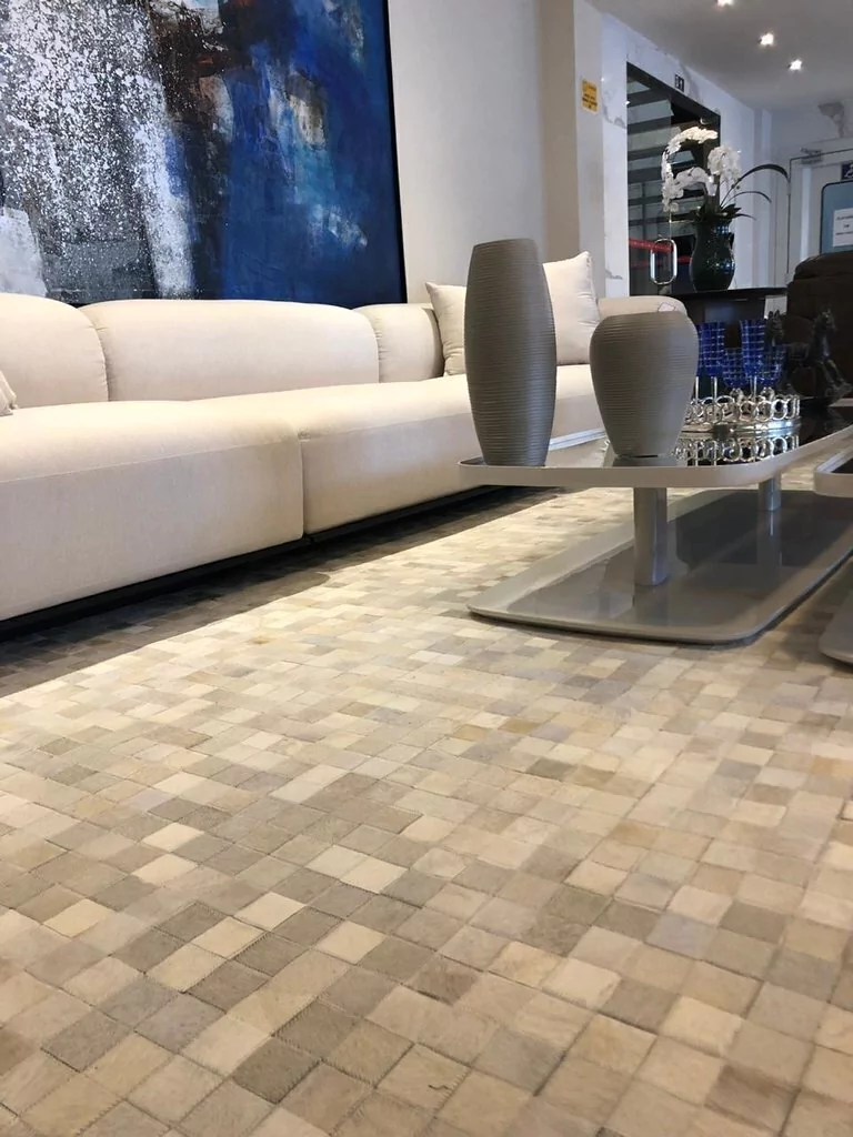 Confeccionado com recortes quadrados de couro legítimo natural em tons cinza, marfim e branco. Tapete forrado, antiderrapante , impermeável e com tratamento especial para decoração.