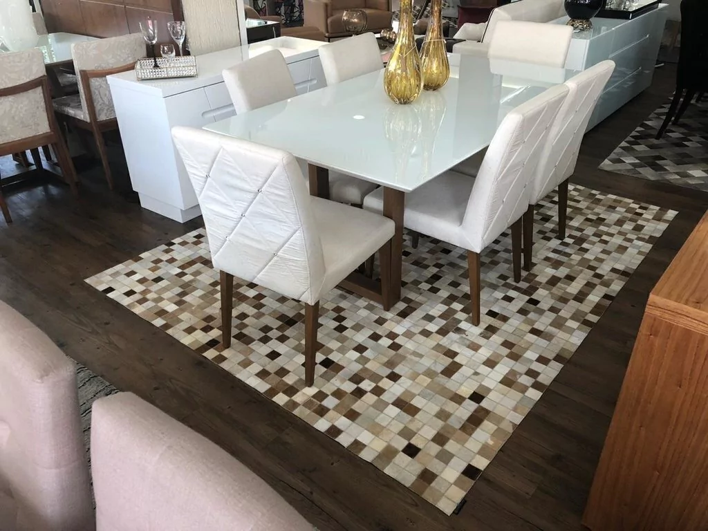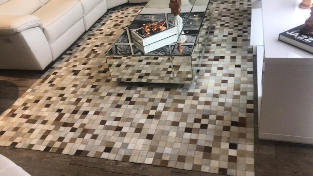 Confeccionado com recortes quadrados de couro legítimo natural em tons bege escuro, bege claro, marrom. Tapete forrado, antiderrapante , impermeável e com tratamento especial para decoração.