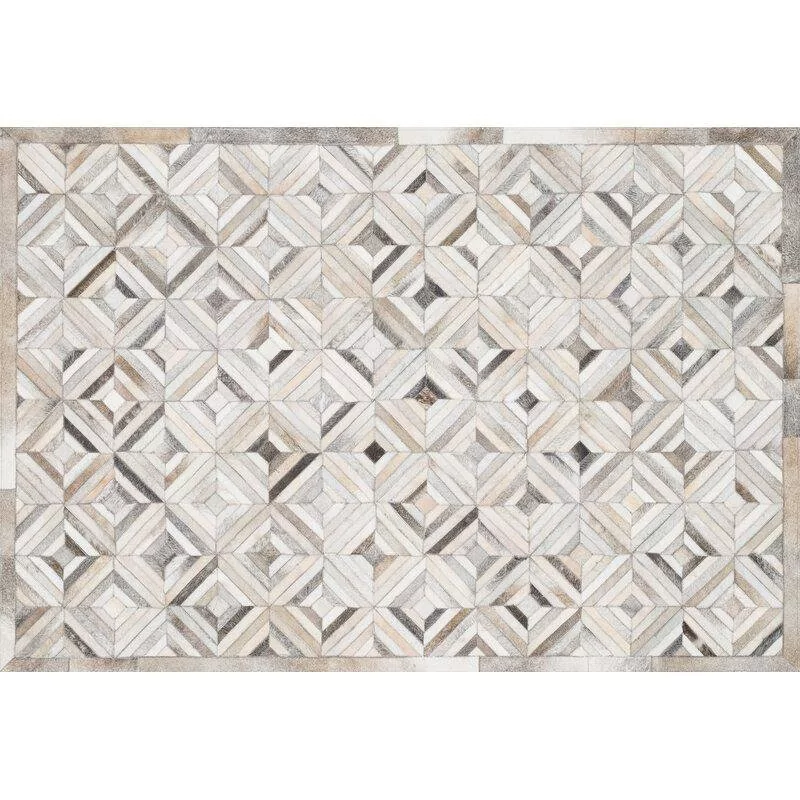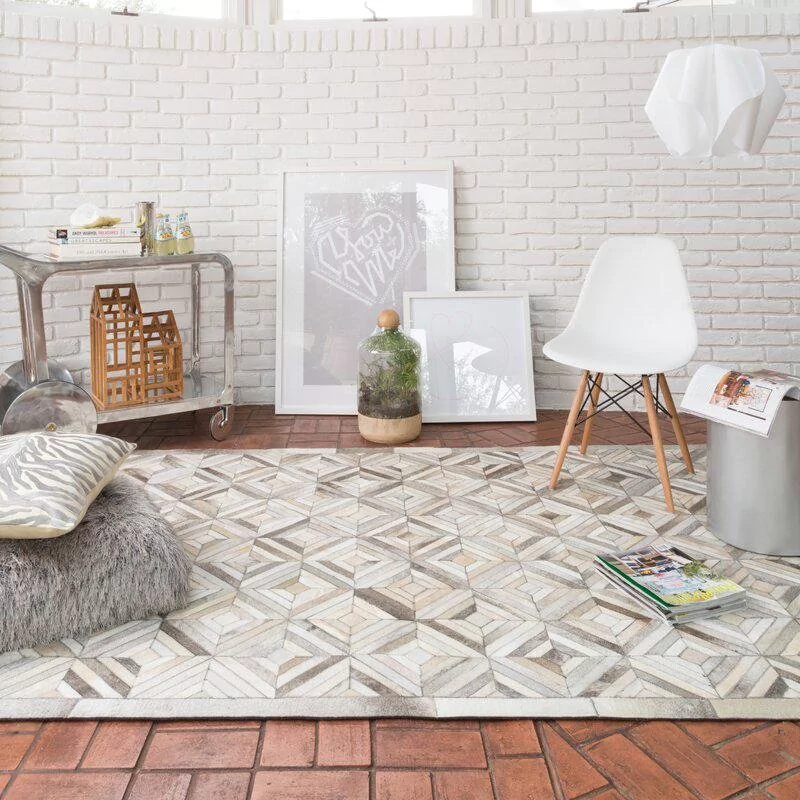 Confeccionado com recortes quadrados de couro legítimo natural em tons cinza, creme e marfim. Tapete forrado, antiderrapante , impermeável e com tratamento especial para decoração.