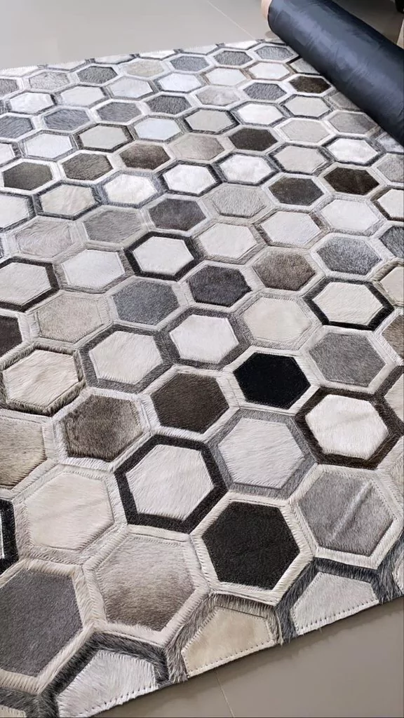 Confeccionado com recortes geométricos de couro legítimo natural em tons de cinza, cinza claro e offhwite. Tapete forrado, antiderrapante , impermeável e com tratamento especial para decoração.