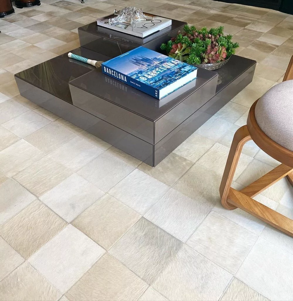 Confeccionado com recortes quadrados de couro legítimo natural em tons champanhe claro, marfin e creme. Tapete forrado, antiderrapante , impermeável e com tratamento especial para decoração.