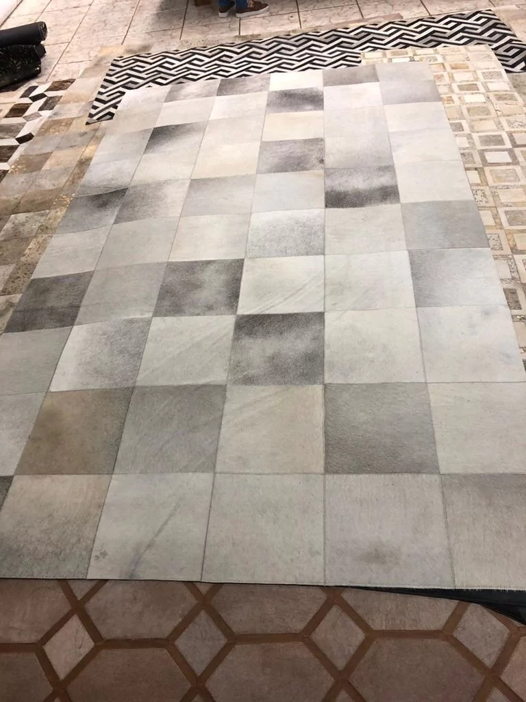 Confeccionado com recortes quadrados de couro legítimo natural em tons cinza claro, cinza escuro e creme. Tapete forrado, antiderrapante , impermeável e com tratamento especial para decoração.