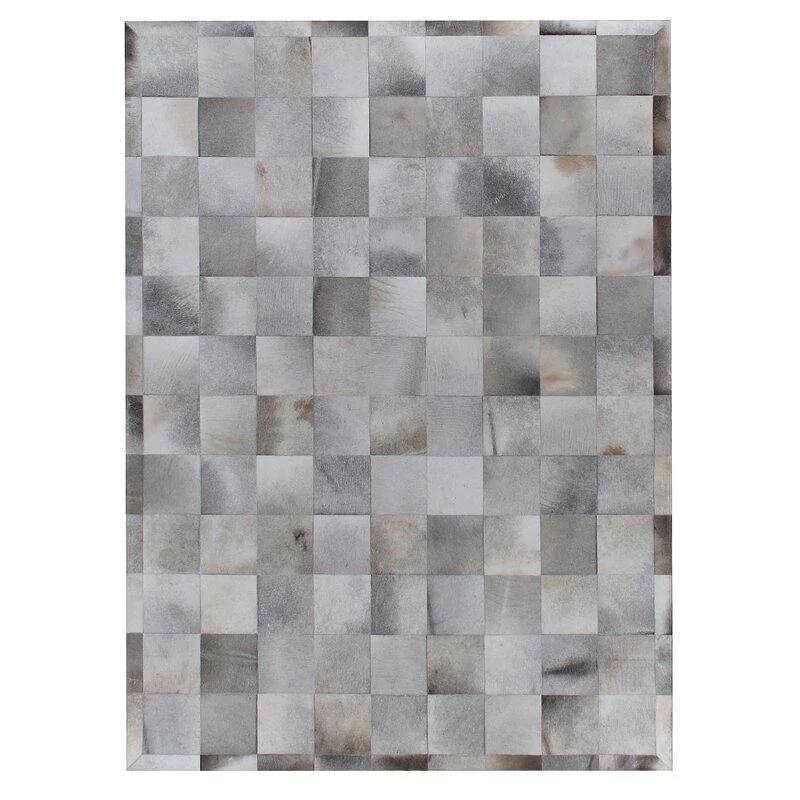 Confeccionado com recortes quadrados de couro legítimo natural em tons cinza claro, cinza escuro e creme. Tapete forrado, antiderrapante , impermeável e com tratamento especial para decoração.