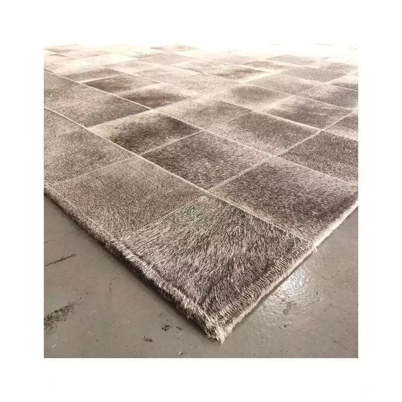 Confeccionado com recortes quadrados de couro legítimo natural em tons de caramelo, bege e cinza. Tapete forrado, antiderrapante , impermeável e com tratamento especial para decoração.