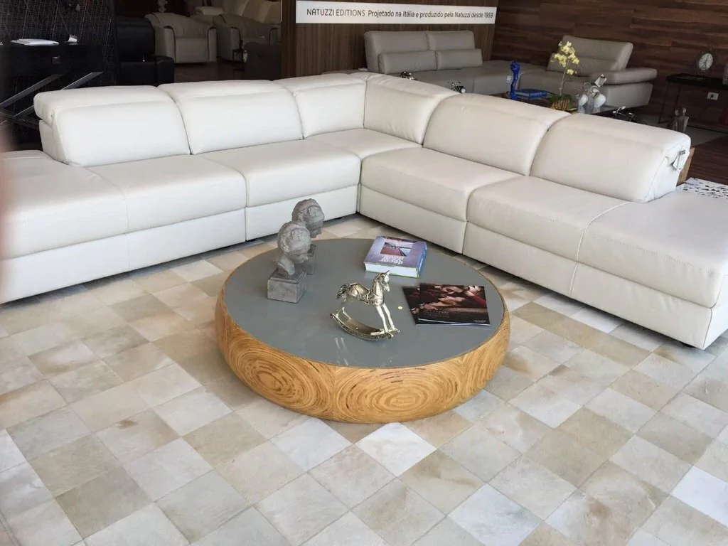 Confeccionado com recortes quadrados de couro legítimo natural em tons creme. Tapete forrado, antiderrapante , impermeável e com tratamento especial para decoração.