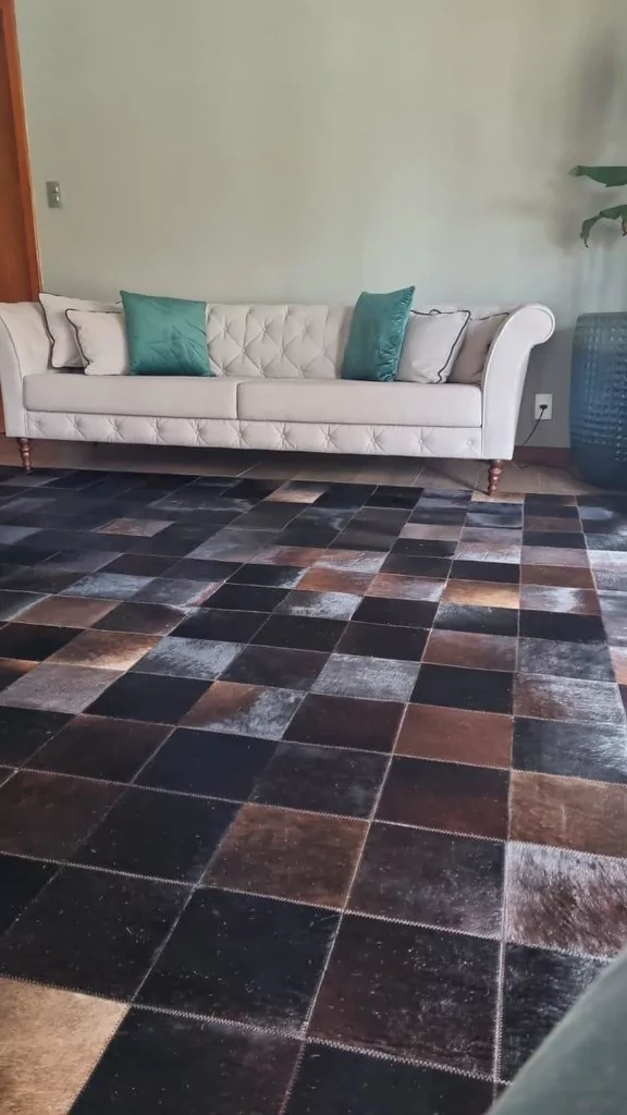 Confeccionado com recortes quadrados de couro legítimo natural em tons de marrom e café. Tapete forrado, antiderrapante , impermeável e com tratamento especial para decoração.