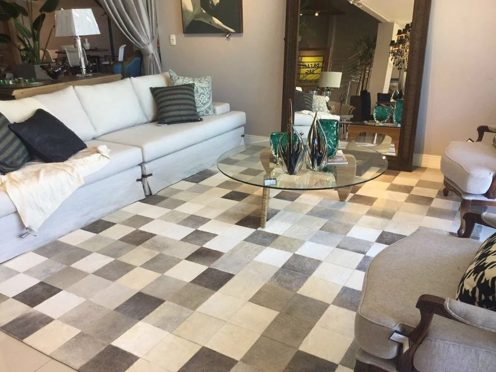 Confeccionado com recortes quadrados de couro legítimo natural em tons offwhite, branco, cinza e marfim. Tapete forrado, antiderrapante , impermeável e com tratamento especial para decoração.