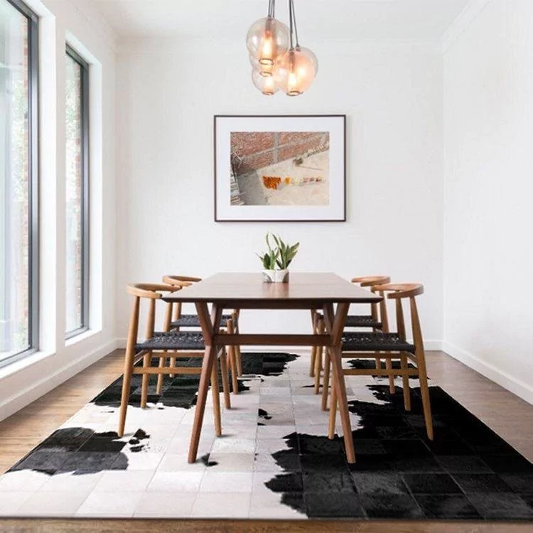 Confeccionado com recortes quadrados de couro legítimo natural em tons preto e offwhite. Tapete forrado, antiderrapante , impermeável e com tratamento especial para decoração.