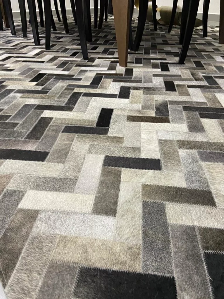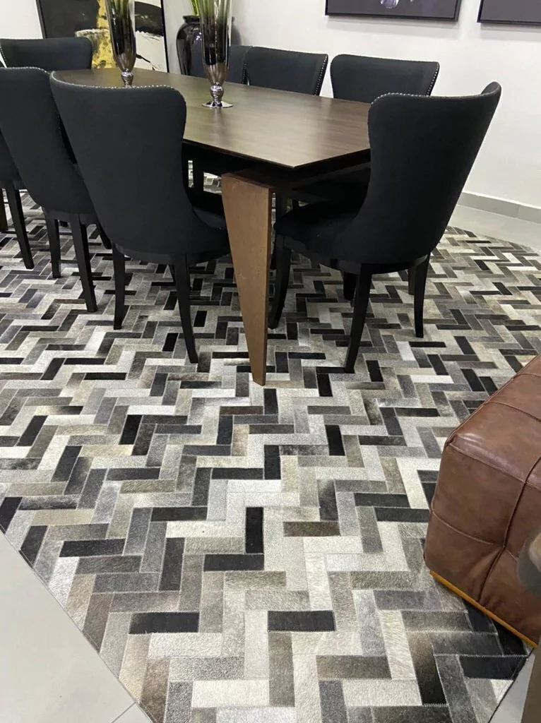 Tapete de Couro confeccionado com recortes geométricos de couro legítimo natural em tons cinza. Tapete forrado, antiderrapante e com tratamento especial para decoração.
