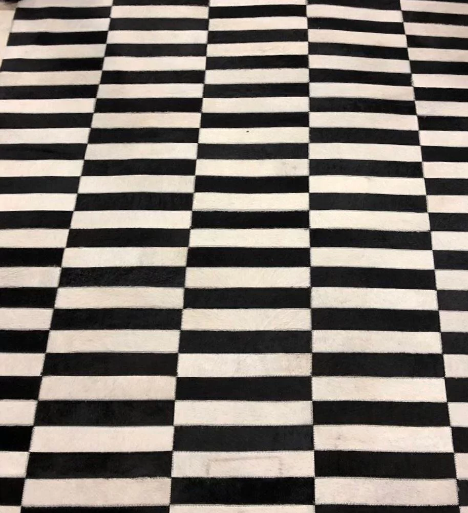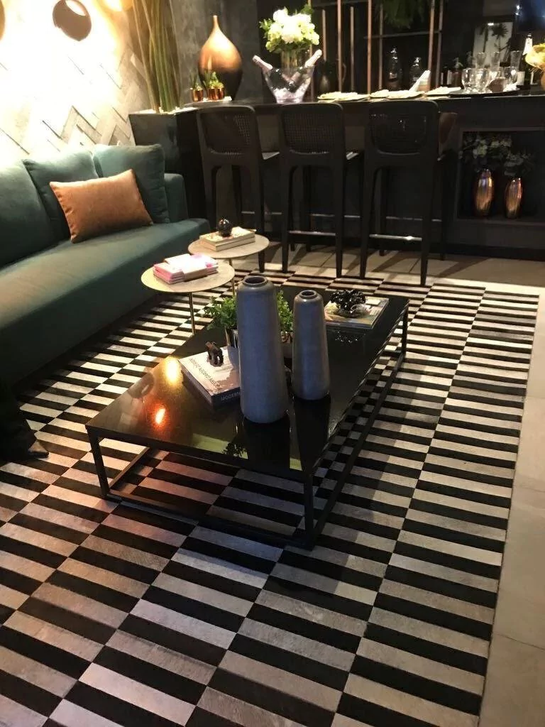 Confeccionado com recortes quadrados de couro legítimo natural em tons de preto e cinza. Tapete forrado, antiderrapante , impermeável e com tratamento especial para decoração.