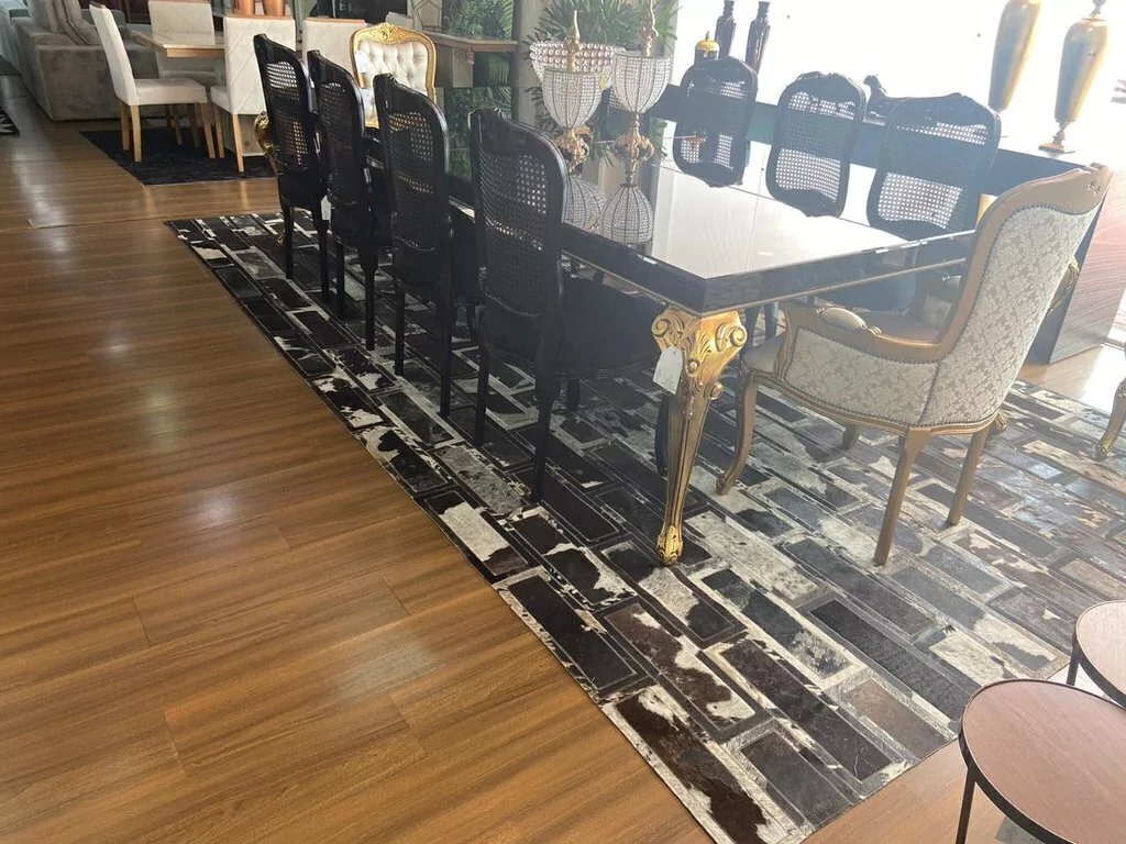 Confeccionado com recortes quadrados de couro legítimo natural em tons preto, branco e creme. Tapete forrado, antiderrapante , impermeável e com tratamento especial para decoração.
