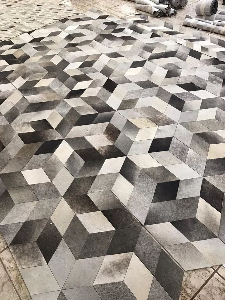 Confeccionado com recortes geométricos de couro legítimo natural em tons de cinza, prata, preto e offwhite. Tapete forrado, antiderrapante , impermeável e com tratamento especial para decoração.