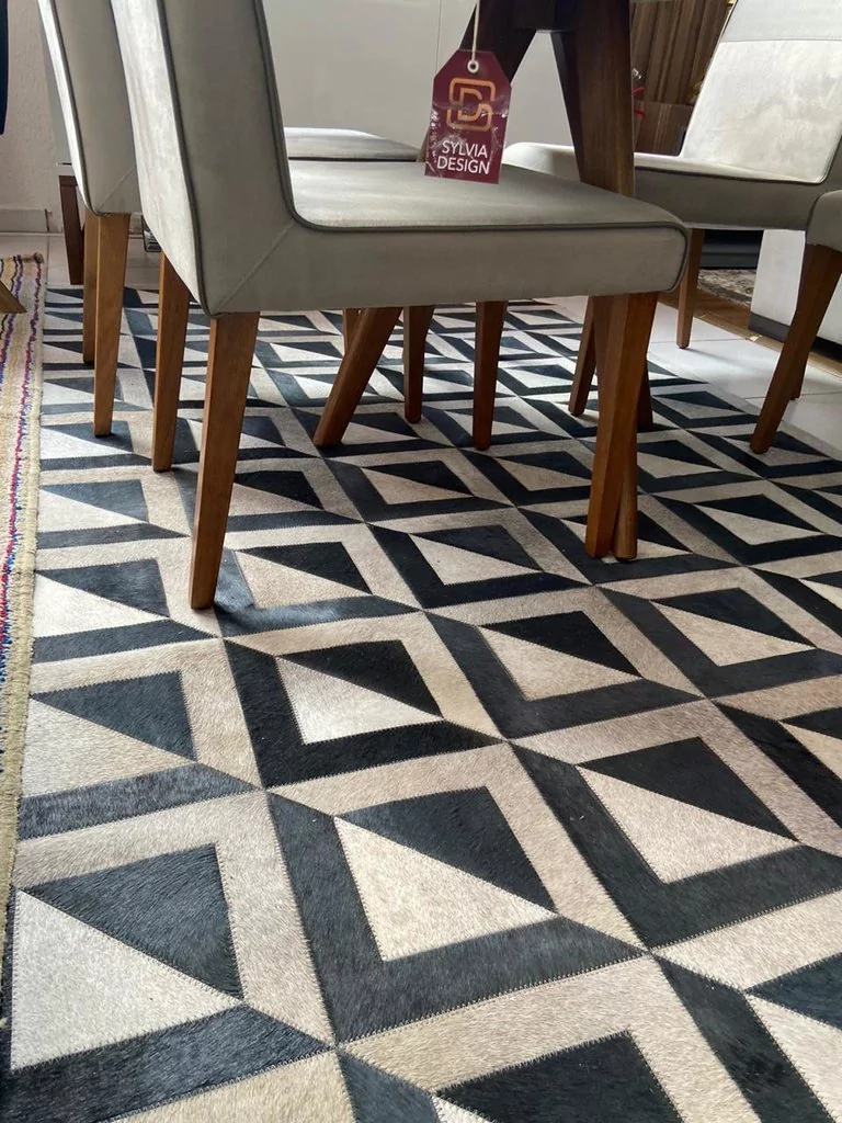 Confeccionado com recortes geométricos de couro legítimo natural em tons de preto e champanhe. Tapete forrado, antiderrapante , impermeável e com tratamento especial para decoração.